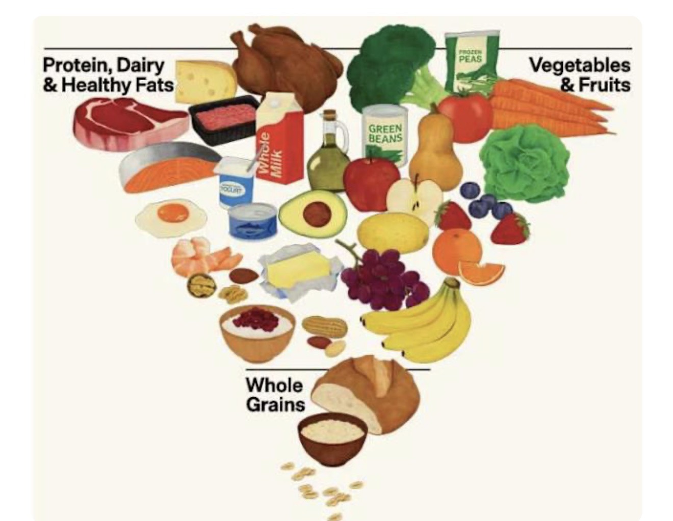 新版指南徹底顛覆長期以來「以碳水化合物為飲食基礎」的傳統觀念。過去被視為主角的全穀類,如今退居相對次要位置;蛋白質與健康脂肪則被放在飲食結構的核心。