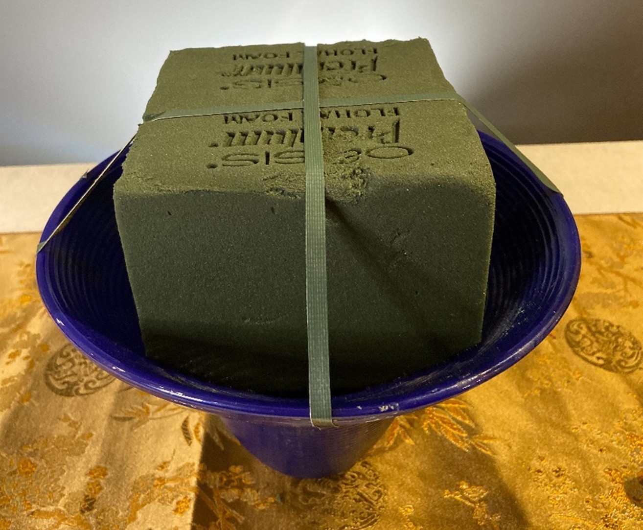本次作品使用螺型花器作為容器,先將方形海棉放置在花器中,使用布膠做十字固定在容器上。