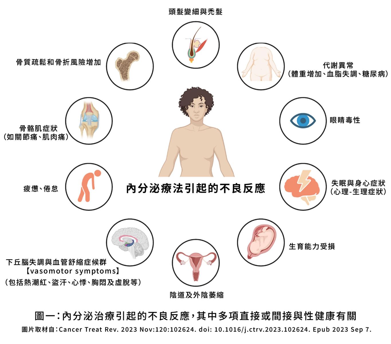 一、荷爾蒙治療、化學治療、標靶治療的藥物可能有噁心、疼痛、疲勞等副作用,加上治療期間心理上可能有恐懼、沮喪、失落、焦慮等,使癌友不太可能想要從任何形式的性活動或以任何方式感受到性行為。以賀爾蒙治療為例,如圖一所示,可能引起很多相關副作用,其中很多與性健康有關。